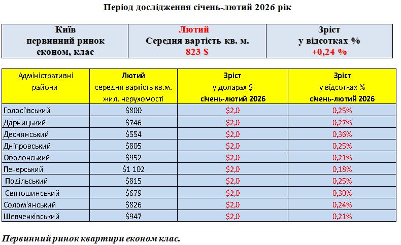 ПЕРВИННИЙ РИНОК ЖИТЛОВОЇ НЕРУХОМОСТІ ЕКОНОМ КЛАС, МІСТО КИЇВ, ЛЮТИЙ 2026 РІК