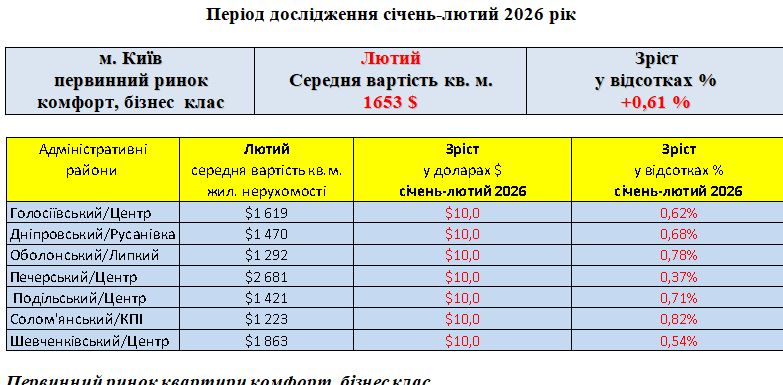 ПЕРВИННИЙ РИНОК ЖИТЛОВОЇ НЕРУХОМОСТІ КОМФОРТ, БІЗНЕС КЛАС, МІСТО КИЇВ, ЛЮТИЙ 2026 РІК