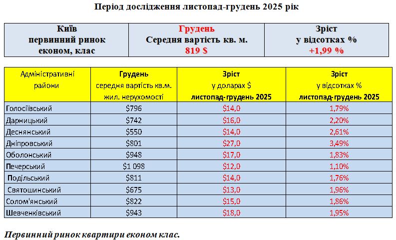 ПЕРВИННИЙ РИНОК ЖИТЛОВОЇ НЕРУХОМОСТІ ЕКОНОМ КЛАС, МІСТО КИЇВ, ГРУДЕНЬ 2025 РІК