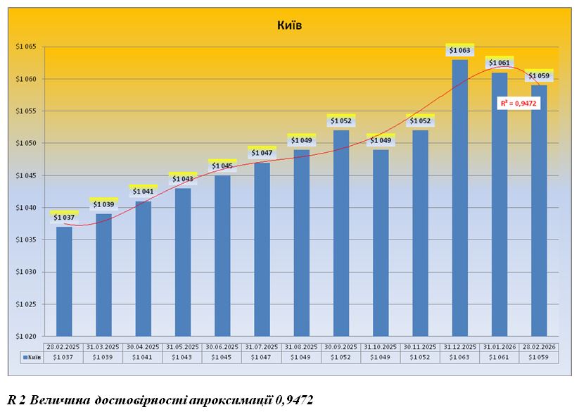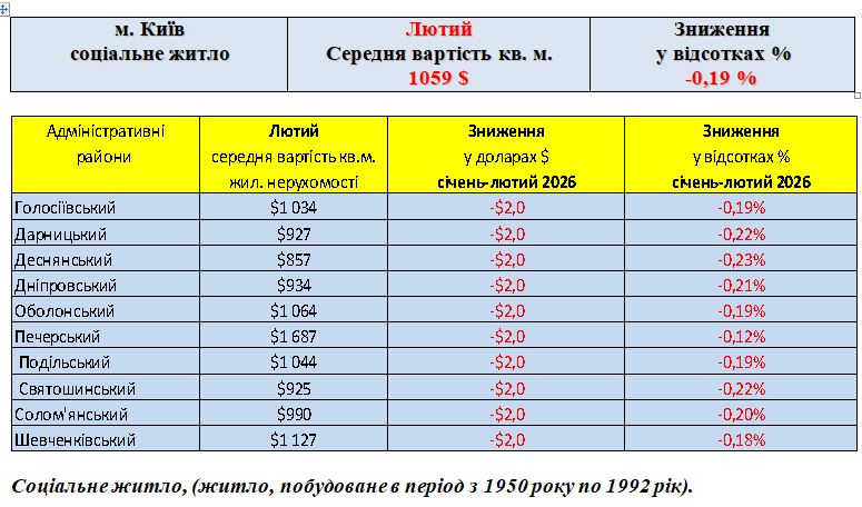 Середня вартість квадратного метру житлової нерухомості на вторинному ринку (соціальне житло) в місті Київ за період з 28 лютого 2025 року, по 28 лютого 2026 року підвищилася в відносних величинах на +2,12 %.