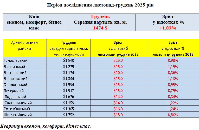 РИНОК ЖИТЛОВОЇ НЕРУХОМОСТІ ЕКОНОМ, КОМФОРТ, БІЗНЕС КЛАС, МІСТО КИЇВ, ГРУДЕНЬ 2025 РІК