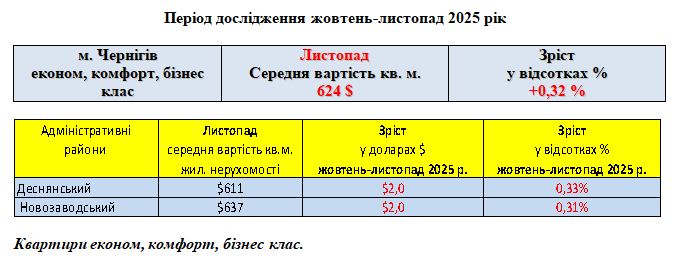 РИНОК ЖИТЛОВОЇ НЕРУХОМОСТІ ЕКОНОМ, КОМФОРТ, БІЗНЕС КЛАС, МІСТО ЧЕРНІГІВ, ЛИСТОПАД 2025 РІК