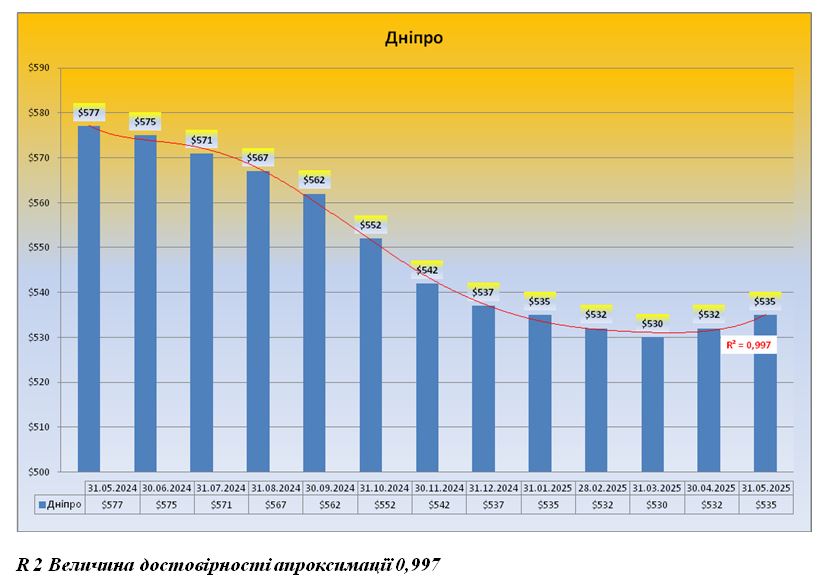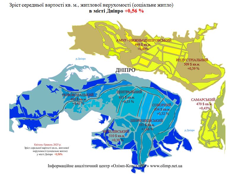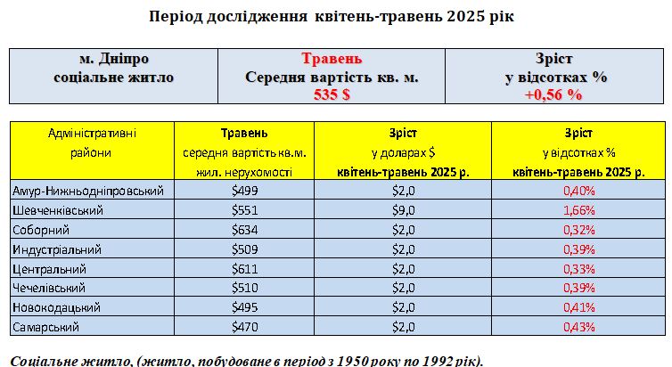 В абсолютних величинах, середня вартість кв. м., житлової нерухомості на вторинному ринку (соціальне житло) в місті Дніпро на дату 30.11.2025 року, склала 547 $ за кв. м., або 23120 грн., за кв. м., за курсом НБУ 42,266 на дату 30.11.2025 року.