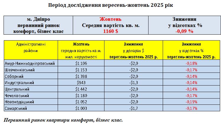 ПЕРВИННИЙ РИНОК ЖИТЛОВОЇ НЕРУХОМОСТІ КОМФОРТ, БІЗНЕС КЛАС, МІСТО ДНІПРО, ЖОВТЕНЬ 2025 РІК