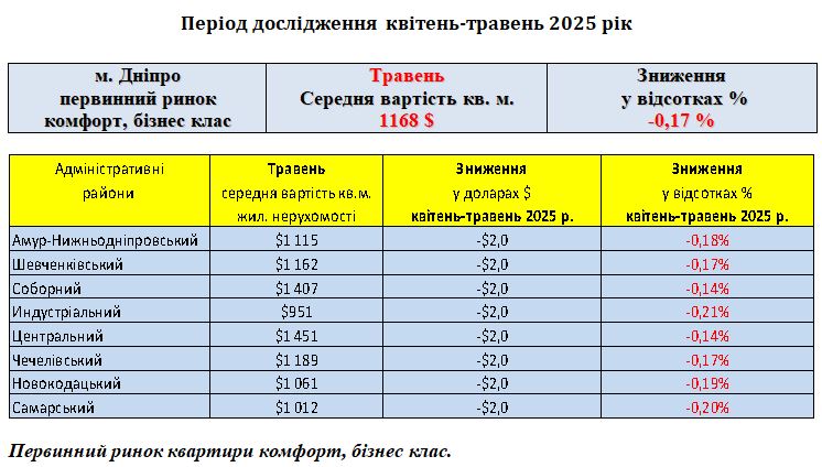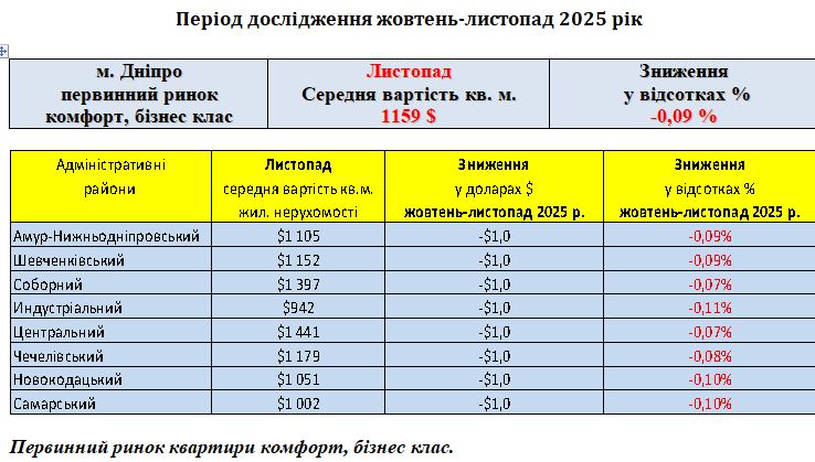 ПЕРВИННИЙ РИНОК ЖИТЛОВОЇ НЕРУХОМОСТІ КОМФОРТ, БІЗНЕС КЛАС, МІСТО ДНІПРО, ЛИСТОПАД 2025 РІК