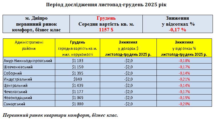 ПЕРВИННИЙ РИНОК ЖИТЛОВОЇ НЕРУХОМОСТІ КОМФОРТ, БІЗНЕС КЛАС, МІСТО ДНІПРО, ГРУДЕНЬ 2025 РІК
