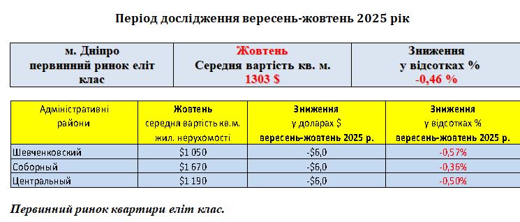 ПЕРВИННИЙ РИНОК ЖИТЛОВОЇ НЕРУХОМОСТІ ЕЛІТ КЛАС, МІСТО ДНІПРО, ЖОВТЕНЬ 2025 РІК