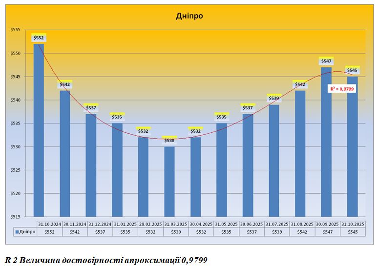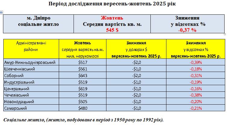 В абсолютних величинах, середня вартість кв. м., житлової нерухомості на вторинному ринку (соціальне житло) в місті Дніпро на дату 31.10.2025 року, склала 545 $ за кв. м., або 22874 грн., за кв. м., за курсом НБУ 41,970 на дату 31.10.2025 року.