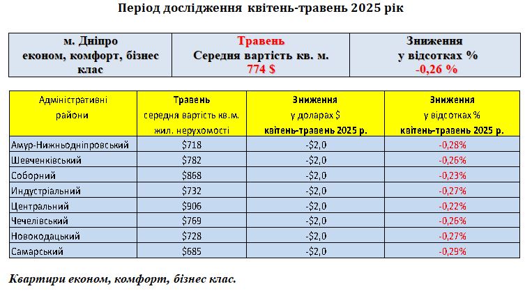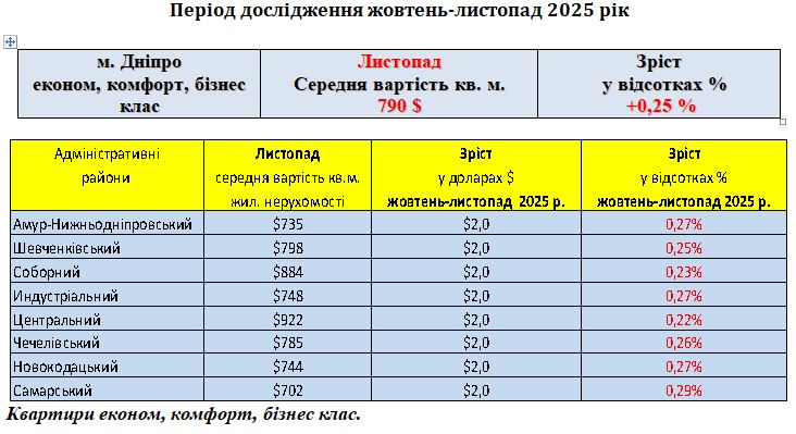 РИНОК ЖИТЛОВОЇ НЕРУХОМОСТІ ЕКОНОМ, КОМФОРТ, БІЗНЕС КЛАС, МІСТО ДНІПРО, ЛИСТОПАД 2025 РІК