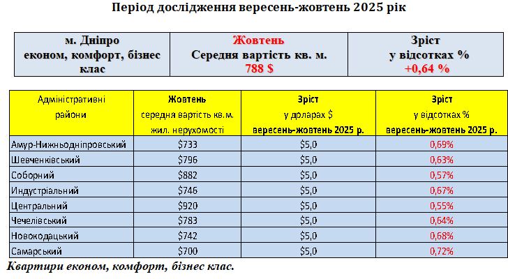 РИНОК ЖИТЛОВОЇ НЕРУХОМОСТІ ЕКОНОМ, КОМФОРТ, БІЗНЕС КЛАС, МІСТО ДНІПРО, ЖОВТЕНЬ 2025 РІК