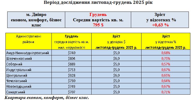 РИНОК ЖИТЛОВОЇ НЕРУХОМОСТІ ЕКОНОМ, КОМФОРТ, БІЗНЕС КЛАС, МІСТО ДНІПРО, ГРУДЕНЬ 2025 РІК