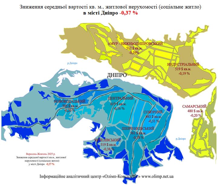 Середня вартість квадратного метру житлової нерухомості на вторинному ринку (соціальне житло) в місті Дніпро за період з 31жовтня 2024 року, по 31 жовтня 2025 року знизилася в відносних величинах на -1,27 %.