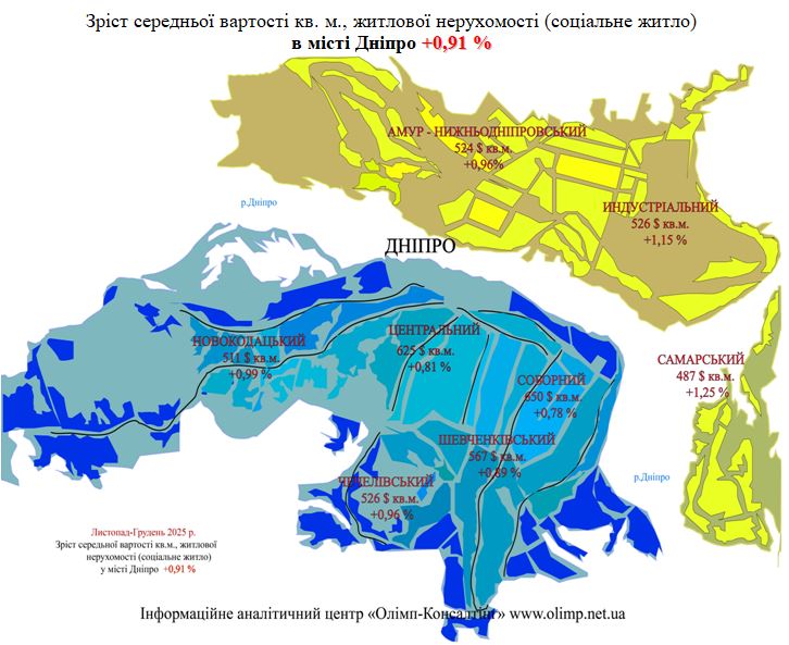 Середня вартість квадратного метру житлової нерухомості на вторинному ринку (соціальне житло) в місті Дніпро за період з 31 грудня 2024 року, по 31 грудня 2025 року підвищилася в відносних величинах на +2,79 %.