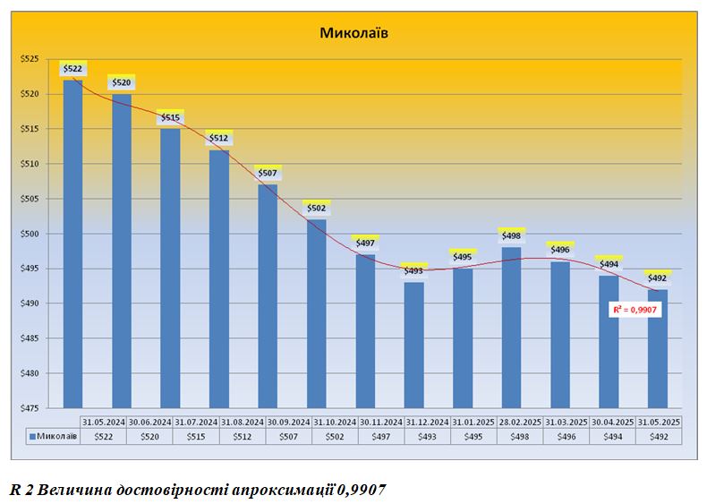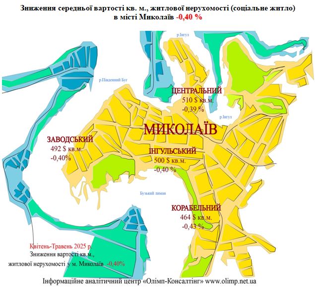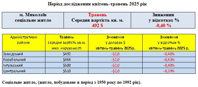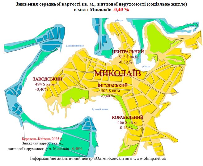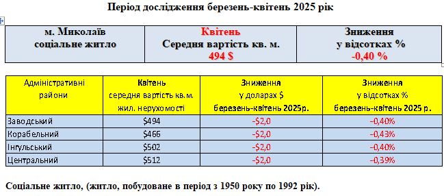 В абсолютних величинах, середня вартість кв. м., житлової нерухомості на вторинному ринку (соціальне житло) в місті Миколаїв на дату 30.11.2025 року, склала 483 $ за кв. м., або 20414 грн., за кв. м., за курсом НБУ 42,266 на дату 30.11.2025 року.