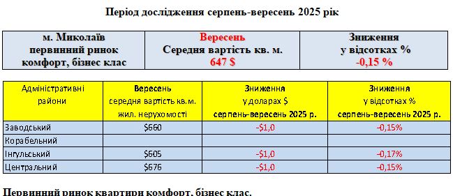 ПЕРВИННИЙ РИНОК ЖИТЛОВОЇ НЕРУХОМОСТІ КОМФОРТ, БІЗНЕС КЛАС, МІСТО МИКОЛАЇВ, ВЕРЕСЕНЬ 2025 РІК
