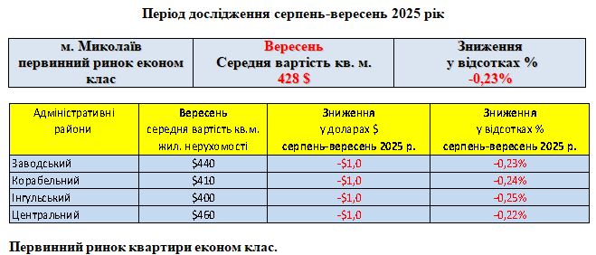 ПЕРВИННИЙ РИНОК ЖИТЛОВОЇ НЕРУХОМОСТІ ЕКОНОМ КЛАС, МІСТО МИКОЛАЇВ, ВЕРЕСЕНЬ 2025 РІК