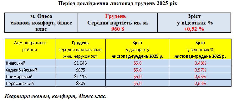 РИНОК ЖИТЛОВОЇ НЕРУХОМОСТІ ЕКОНОМ, КОМФОРТ, БІЗНЕС КЛАС, МІСТО ОДЕСА, ГРУДЕНЬ 2025 РІК
