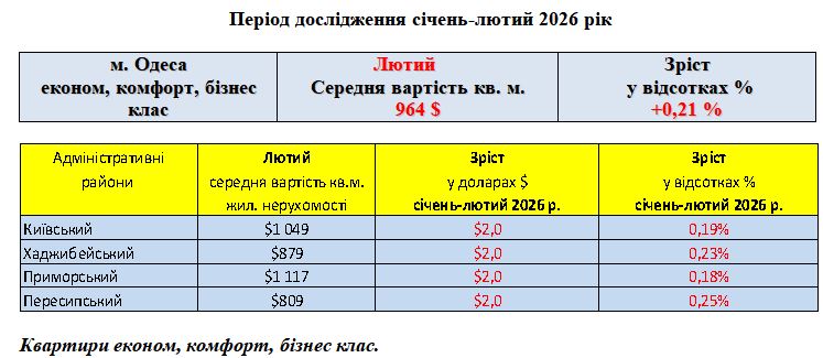РИНОК ЖИТЛОВОЇ НЕРУХОМОСТІ ЕКОНОМ, КОМФОРТ, БІЗНЕС КЛАС, МІСТО ОДЕСА, ЛЮТИЙ 2026 РІК