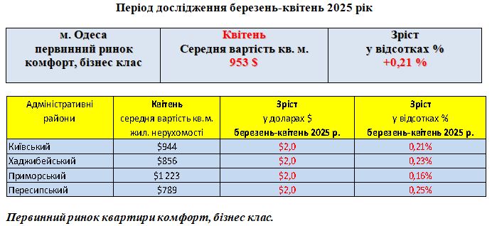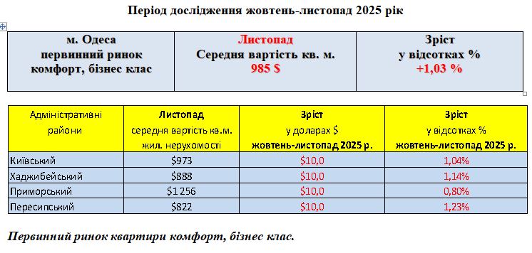 ПЕРВИННИЙ РИНОК ЖИТЛОВОЇ НЕРУХОМОСТІ КОМФОРТ, БІЗНЕС КЛАС, МІСТО ОДЕСА, ЛИСТОПАД 2025 РІК