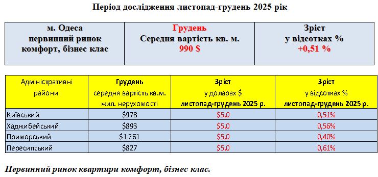 ПЕРВИННИЙ РИНОК ЖИТЛОВОЇ НЕРУХОМОСТІ КОМФОРТ, БІЗНЕС КЛАС, МІСТО ОДЕСА, ГРУДЕНЬ 2025 РІК