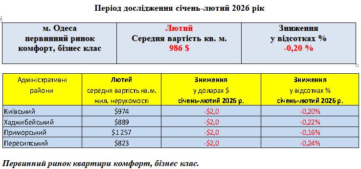 ПЕРВИННИЙ РИНОК ЖИТЛОВОЇ НЕРУХОМОСТІ КОМФОРТ, БІЗНЕС КЛАС, МІСТО ОДЕСА, ЛЮТИЙ 2026 РІК