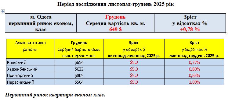 ПЕРВИННИЙ РИНОК ЖИТЛОВОЇ НЕРУХОМОСТІ ЕКОНОМ КЛАС, МІСТО ОДЕСА, ГРУДЕНЬ 2025 РІК