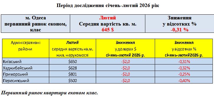 ПЕРВИННИЙ РИНОК ЖИТЛОВОЇ НЕРУХОМОСТІ ЕКОНОМ КЛАС, МІСТО ОДЕСА, ЛЮТИЙ 2026 РІК