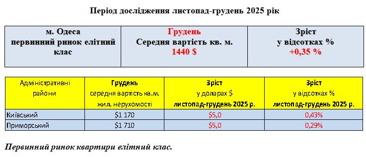ПЕРВИННИЙ РИНОК ЖИТЛОВОЇ НЕРУХОМОСТІ ЄЛИТ КЛАС, МІСТО ОДЕСА,ГРУДЕНЬ 2025 РІК