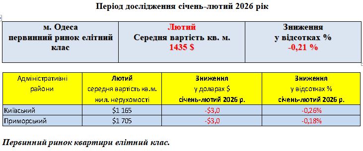 ПЕРВИННИЙ РИНОК ЖИТЛОВОЇ НЕРУХОМОСТІ ЄЛИТ КЛАС, МІСТО ОДЕСА, ЛЮТИЙ 2026 РІК