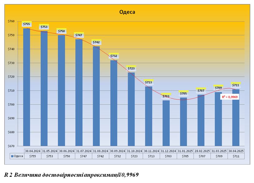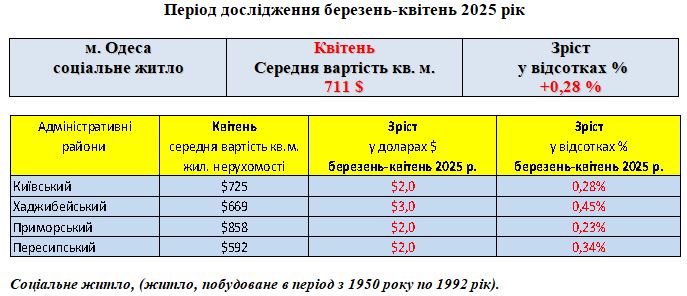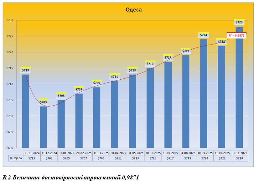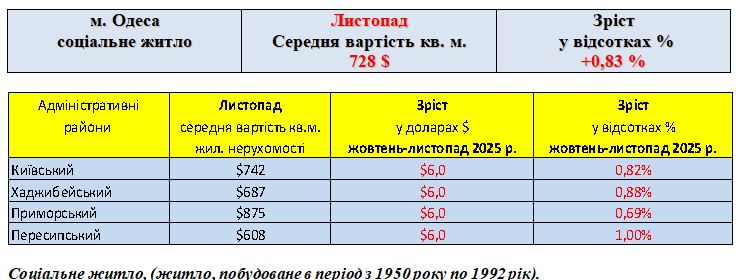 В абсолютних величинах, середня вартість кв. м., житлової нерухомості на вторинному ринку (соціальне житло) в місті Одеса на дату 30.11.2025 року, склала 728 $ за кв. м., або 30770 грн., за кв. м., за курсом НБУ 42,266 на дату 30.11.2025 року.
