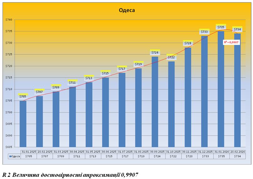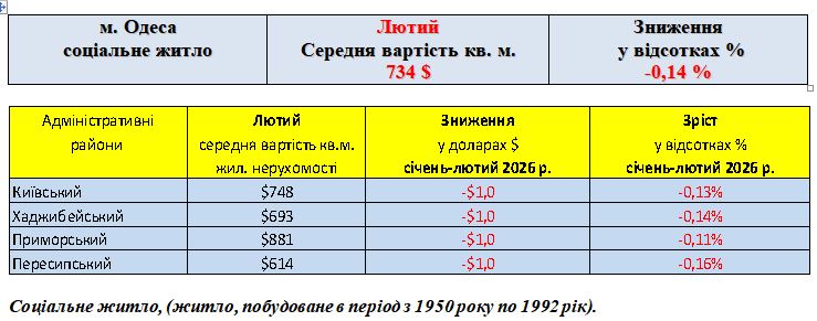 В абсолютних величинах, середня вартість кв. м., житлової нерухомості на вторинному ринку (соціальне житло) в місті Одеса на дату 28.02.2026 року, склала 734 $ за кв. м., або 31715 грн., за кв. м., за курсом НБУ 43,208 на дату 28.02.2026 року.