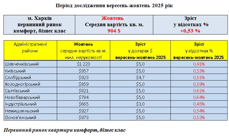 ПЕРВИННИЙ РИНОК ЖИТЛОВОЇ НЕРУХОМОСТІ КОМФОРТ, БІЗНЕС КЛАС, МІСТО ХАРКІВ, ЖОВТЕНЬ 2025 РІК