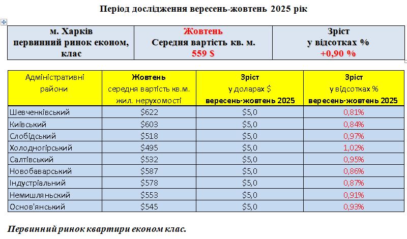 ПЕРВИННИЙ РИНОК ЖИТЛОВОЇ НЕРУХОМОСТІ ЕКОНОМ КЛАС, МІСТО ХАРКІВ, ЖОВТЕНЬ 2025 РІК