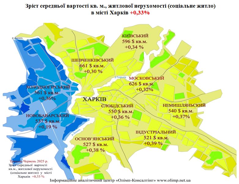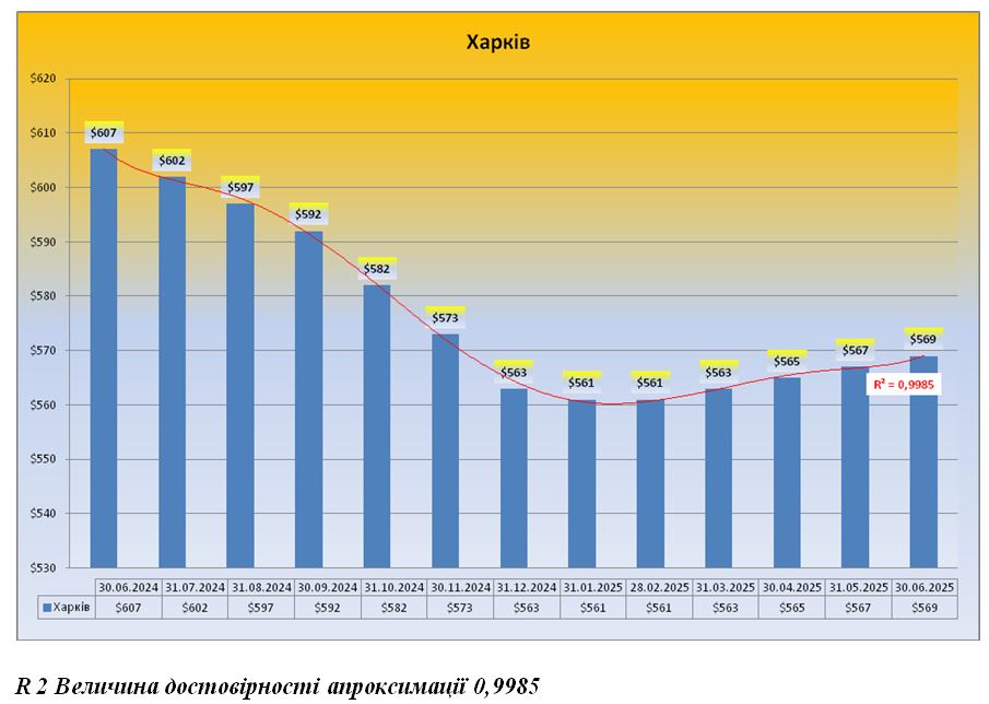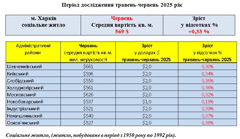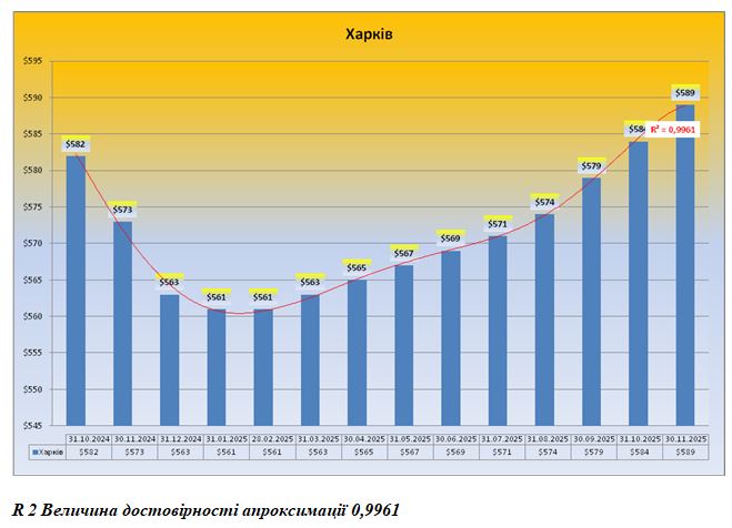 В абсолютних величинах, середня вартість кв. м., житлової нерухомості на вторинному ринку (соціальне житло) в місті Харків на дату 30.11.2025 року, склала 589 $ за кв. м., або 24871 грн., за кв. м., за курсом НБУ 42,266 на дату 30.11.2025 року.