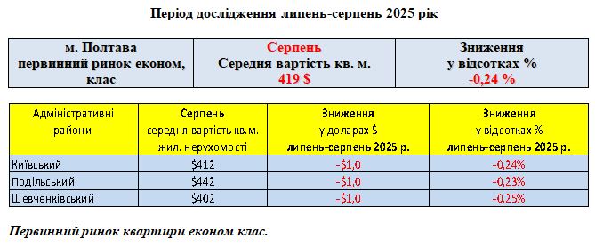 ПЕРВИННИЙ РИНОК ЖИТЛОВОЇ НЕРУХОМОСТІ ЕКОНОМ КЛАС, МІСТО ПОЛТАВА, СЕРПЕНЬ 2025 РІК
