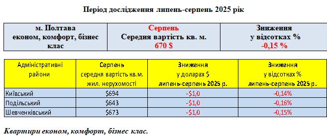 РИНОК ЖИТЛОВОЇ НЕРУХОМОСТІ ЕКОНОМ, КОМФОРТ, БІЗНЕС КЛАС, МІСТО ПОЛТАВА, СЕРПЕНЬ 2025 РІК