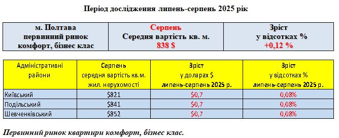 ПЕРВИННИЙ РИНОК ЖИТЛОВОЇ НЕРУХОМОСТІ КОМФОРТ, БІЗНЕС КЛАС, МІСТО ПОЛТАВА, СЕРПЕНЬ 2025 РІК