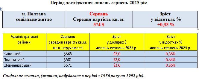 В абсолютних величинах, середня вартість кв. м., житлової нерухомості на вторинному ринку (соціальне житло) в місті Полтава на дату 31.08.2025 року, склала 574 $ за кв. м., або 23683 грн., за кв. м., за курсом НБУ 41,260 на дату 31.08.2025 року.