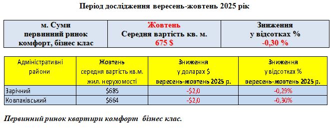 ПЕРВИННИЙ РИНОК ЖИТЛОВОЇ НЕРУХОМОСТІ КОМФОРТ, БІЗНЕС КЛАС, МІСТО СУМИ, ЖОВТЕНЬ 2025 РІК