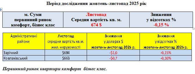 ПЕРВИННИЙ РИНОК ЖИТЛОВОЇ НЕРУХОМОСТІ КОМФОРТ, БІЗНЕС КЛАС, МІСТО СУМИ, ЛИСТОПАД 2025 РІК