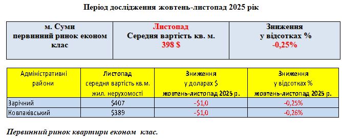 ПЕРВИННИЙ РИНОК ЖИТЛОВОЇ НЕРУХОМОСТІ ЕКОНОМ КЛАС, МІСТО СУМИ, ЛИСТОПАД 2025 РІК