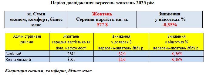 РИНОК ЖИТЛОВОЇ НЕРУХОМОСТІ ЕКОНОМ, КОМФОРТ, БІЗНЕС КЛАС, МІСТО СУМИ, ЖОВТЕНЬ 2025 РІК