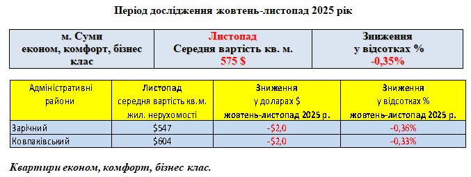 РИНОК ЖИТЛОВОЇ НЕРУХОМОСТІ ЕКОНОМ, КОМФОРТ, БІЗНЕС КЛАС, МІСТО СУМИ, ЛИСТОПАД 2025 РІК
